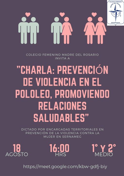 Estimada Comunidad junto con saludarles, Coordinación de Apoyo quiere hacerles llegar una invitación a la «Charla de prevención de violencia en el pololeo, promoviendo relaciones saludables». para las alumnas de 1° y 2° medio este miércoles 18 de agosto a las 16:00 horas en el siguiente link: https://meet.google.com/kbw-gdfj-biy Las esperamos.Atte. Comunidad Femar.